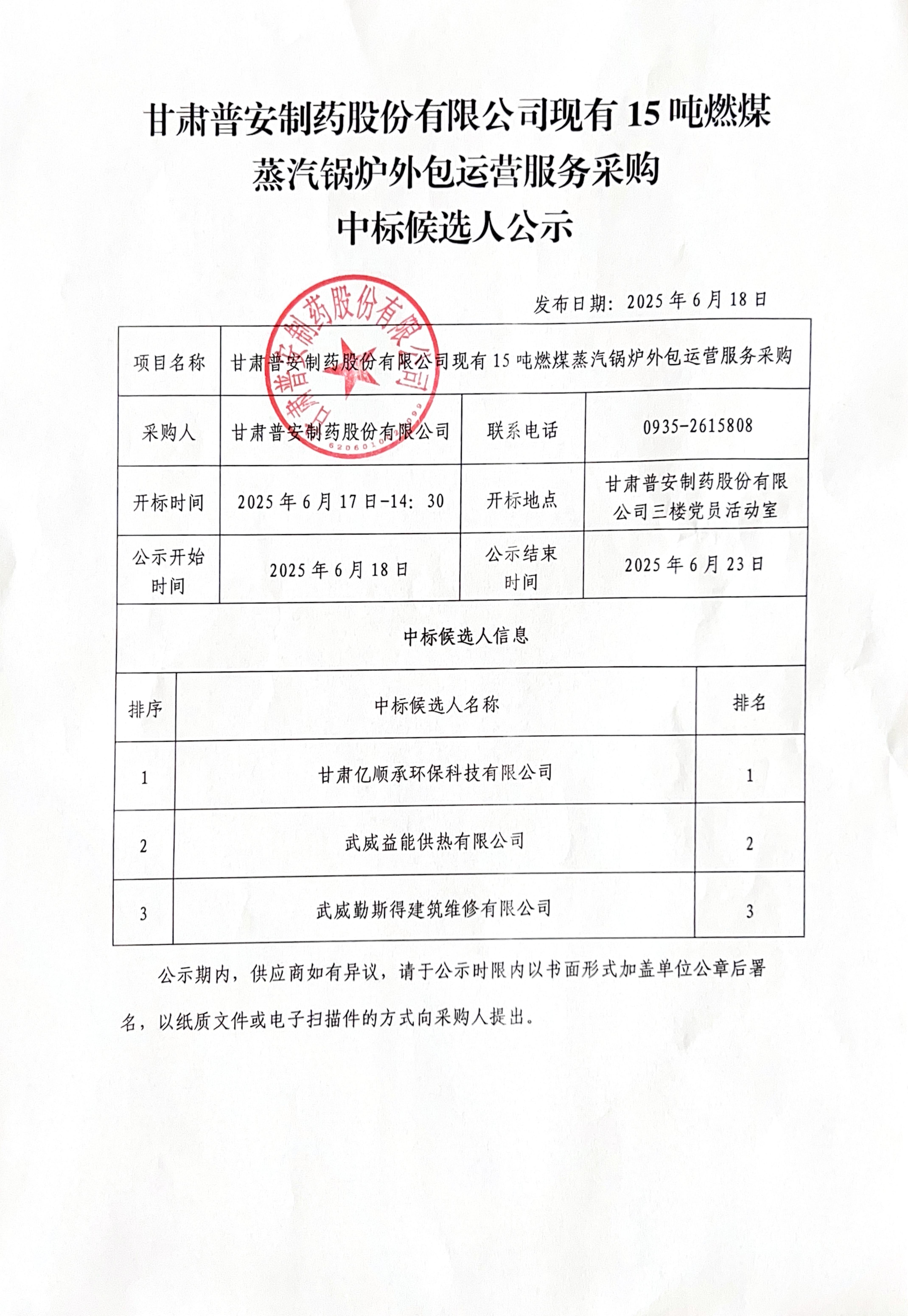 甘肅普安制藥股份有限公司現(xiàn)有15噸燃煤 蒸汽鍋爐外包運營服務采購中標候選人公示