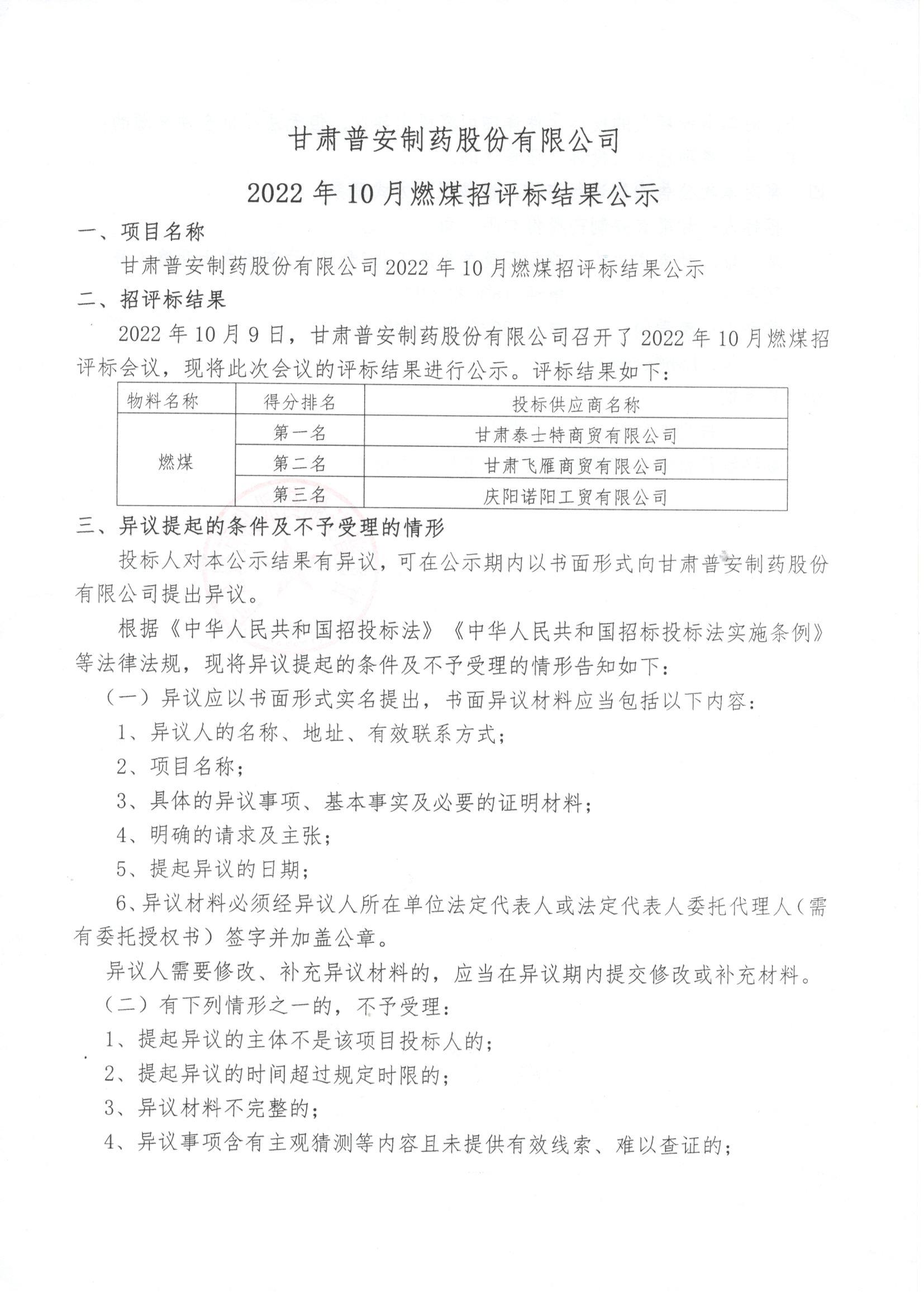 甘肅普安制藥股份有限公司2022年10月燃煤招評標(biāo)結(jié)果的公示