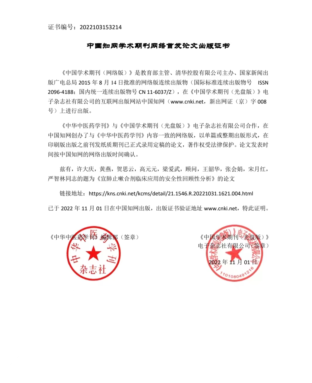 宣肺止嗽合劑真實世界安全性再評價項目產(chǎn)出首篇論文通過網(wǎng)絡(luò)首發(fā)