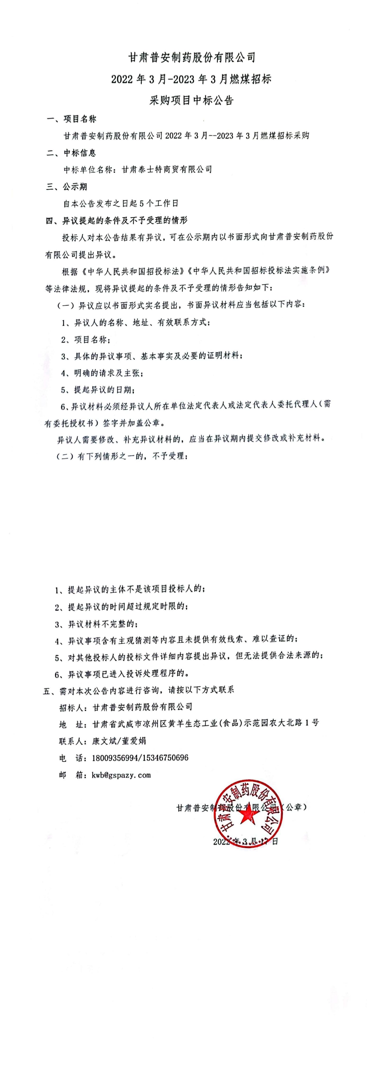 甘肅普安制藥股份有限公司2022年3月-2023年3月燃煤招標(biāo)采購項(xiàng)目中標(biāo)公告