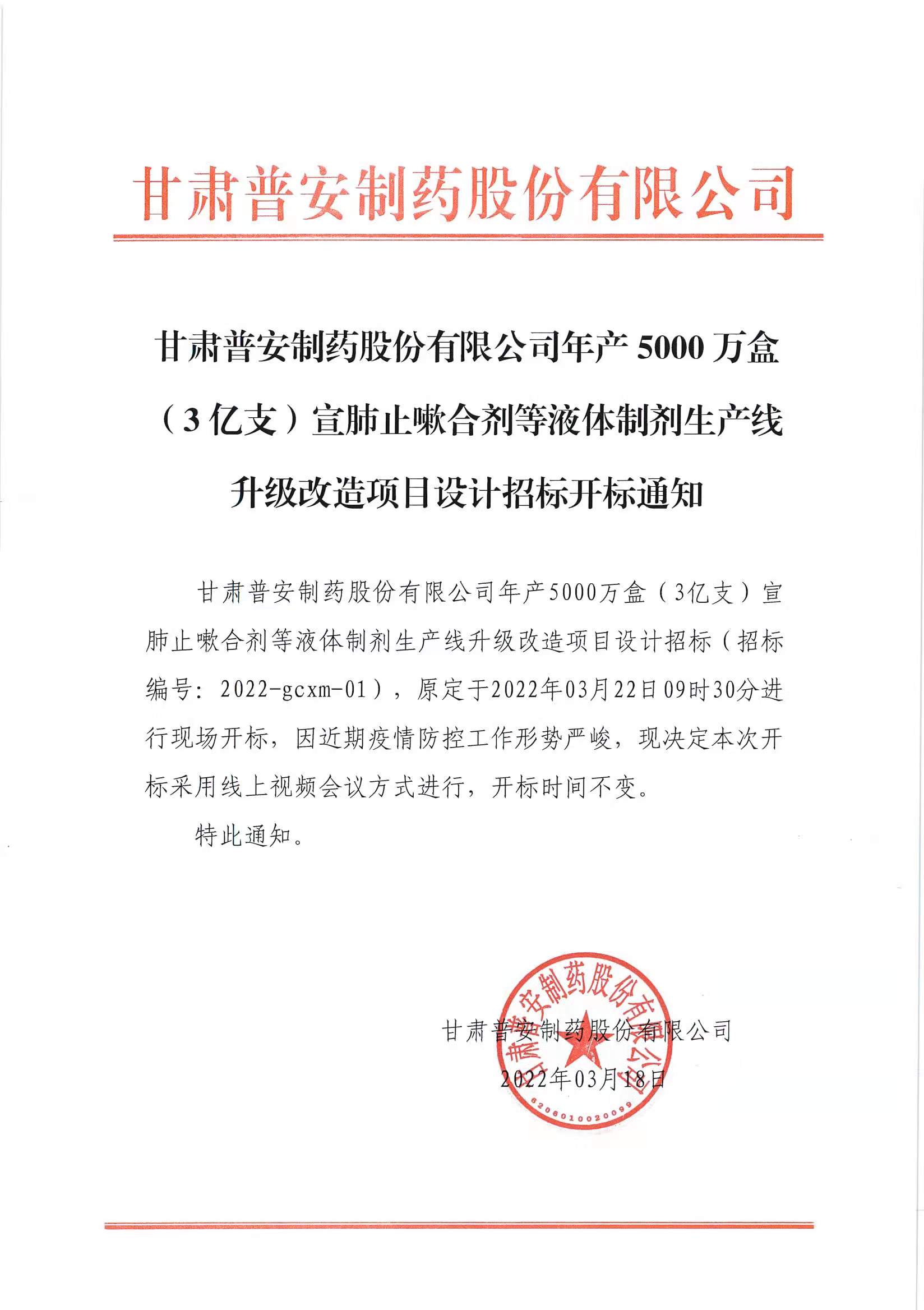 甘肅普安制藥股份有限公司年產(chǎn)5000萬盒(3億支)宣肺止嗽合劑等液體制劑生產(chǎn)線升級改造項目設(shè)計招標(biāo)開標(biāo)通知
