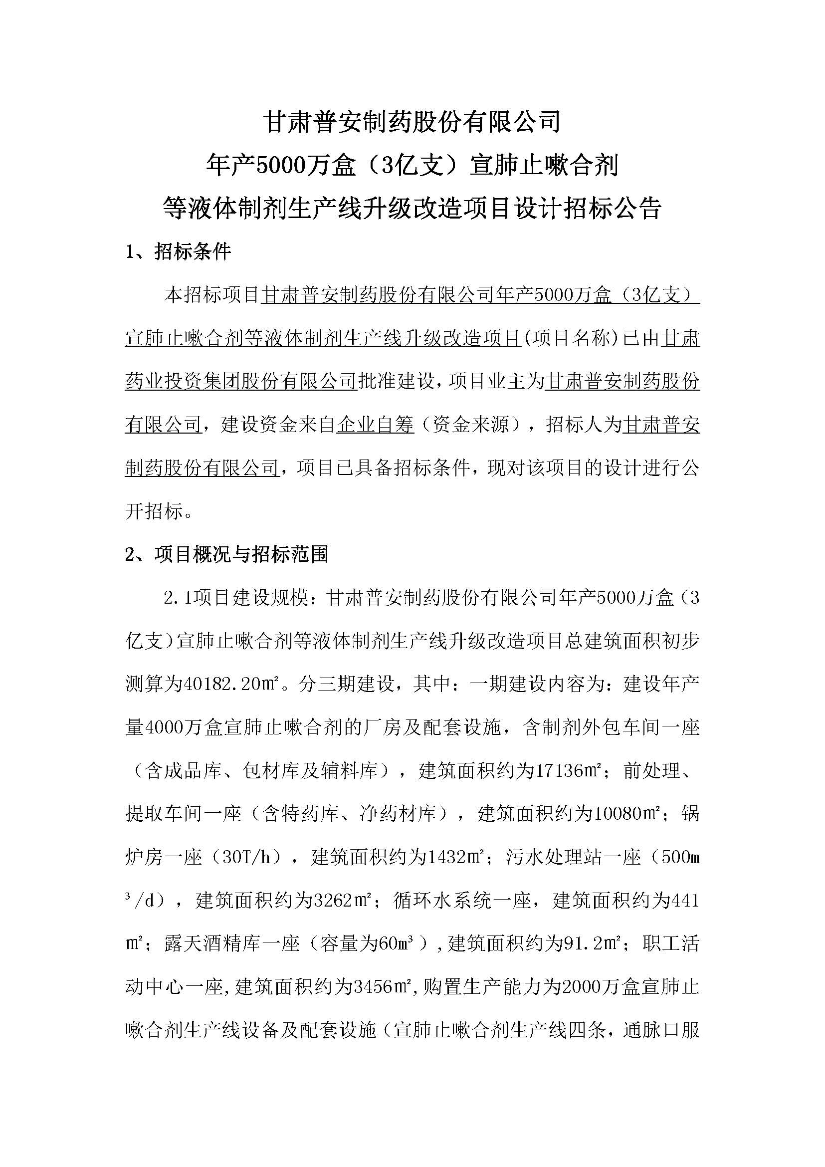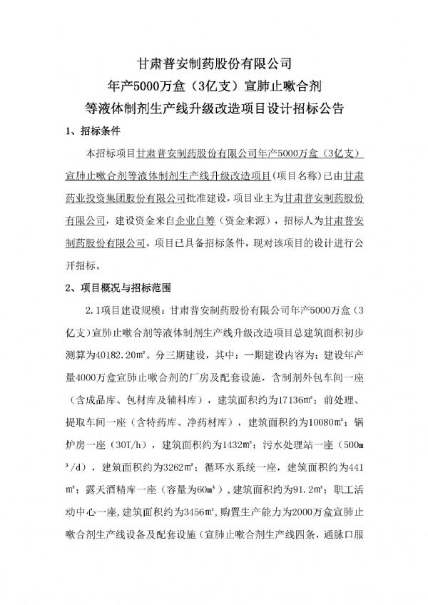 甘肅普安制藥股份有限公司年產(chǎn)5000萬(wàn)盒(3億支)宣肺止嗽合劑等液體制劑生產(chǎn)線升級(jí)改造項(xiàng)目設(shè)計(jì)招標(biāo)公告