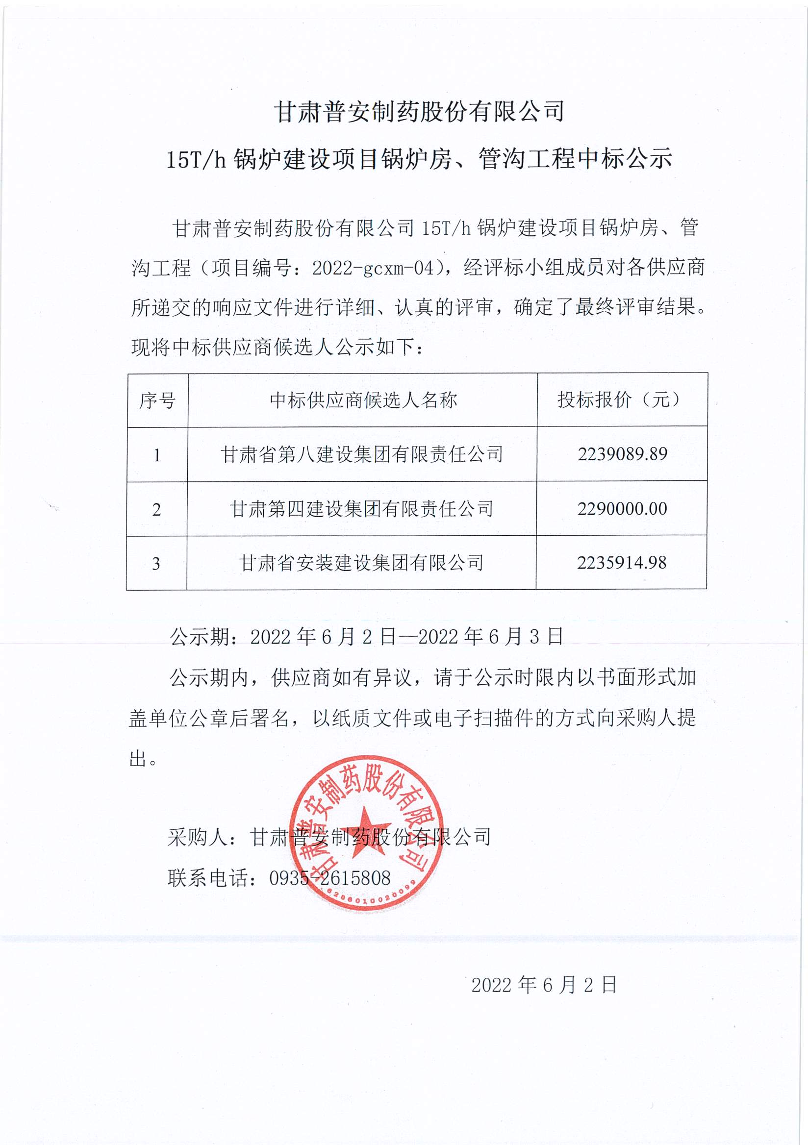 甘肅普安制藥股份有限公司15T/h鍋爐建設(shè)項目鍋爐房、管溝工程中標(biāo)公示