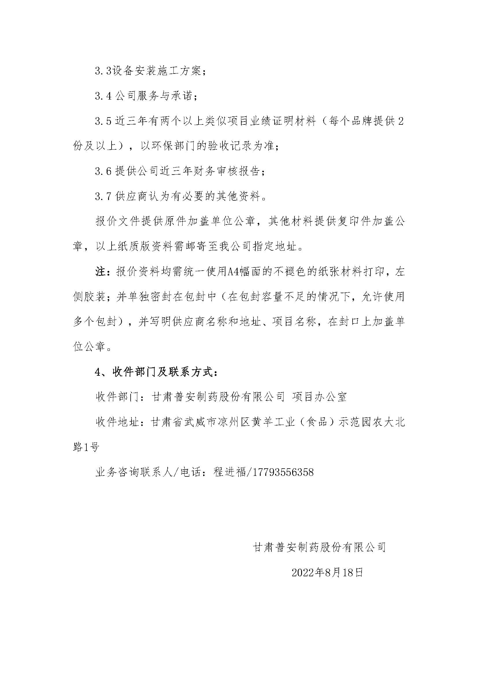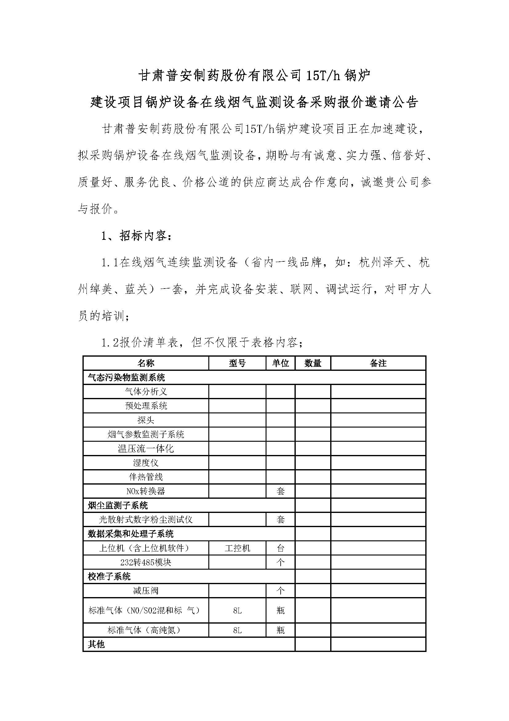 甘肅普安制藥股份有限公司15T/h鍋爐建設項目鍋爐設備在線煙氣監(jiān)測設備采購報價邀請公告