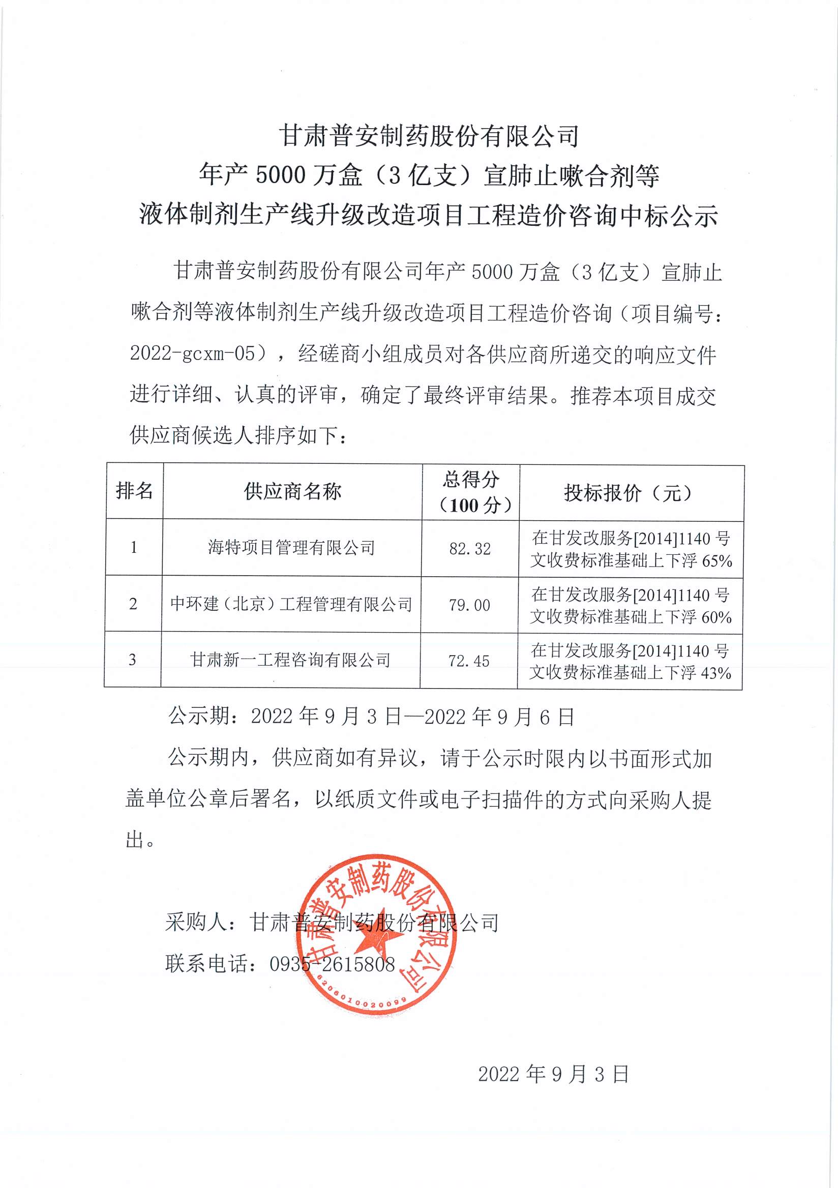甘肅普安制藥股份有限公司年產(chǎn)5000萬(wàn)盒(3億支)宣肺止嗽合劑等液體制劑生產(chǎn)線升級(jí)改造項(xiàng)目工程造價(jià)咨詢中標(biāo)公示