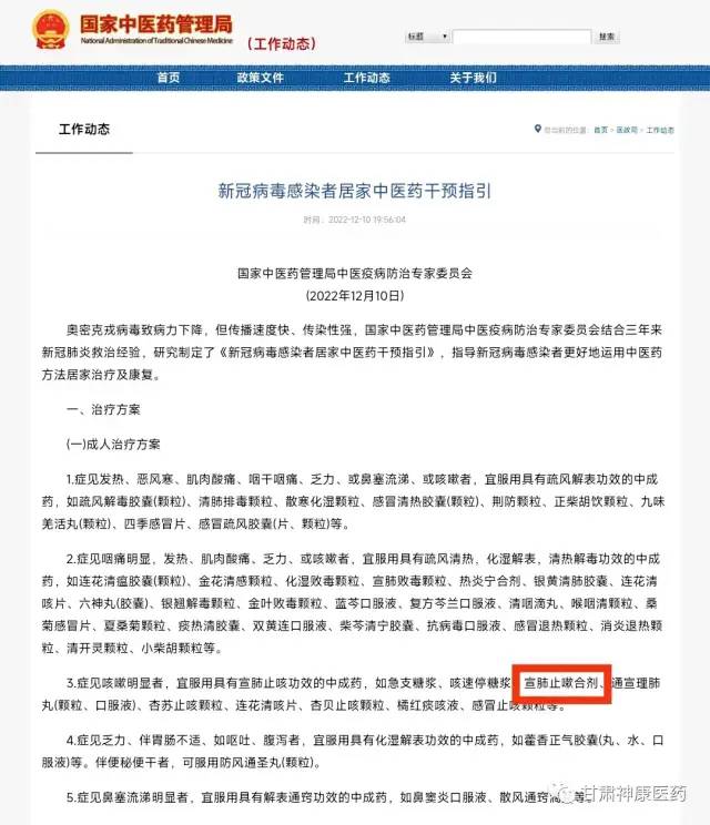 1月5日國家衛(wèi)生健康委辦公廳、國家中醫(yī)藥局綜合司發(fā)布的《新型冠狀病毒感染診療方案(試行第十版)》,在中醫(yī)治療部分,明確提出針對非重點人群的早期新冠病毒感染者,可參照《新冠病毒感染者居家中醫(yī)藥干預(yù)指引》《關(guān)于在城鄉(xiāng)基層充分應(yīng)用中藥湯劑開展新冠病毒感染治療工作的通知》中推薦的中成藥或中藥協(xié)定方,進行居家治療。