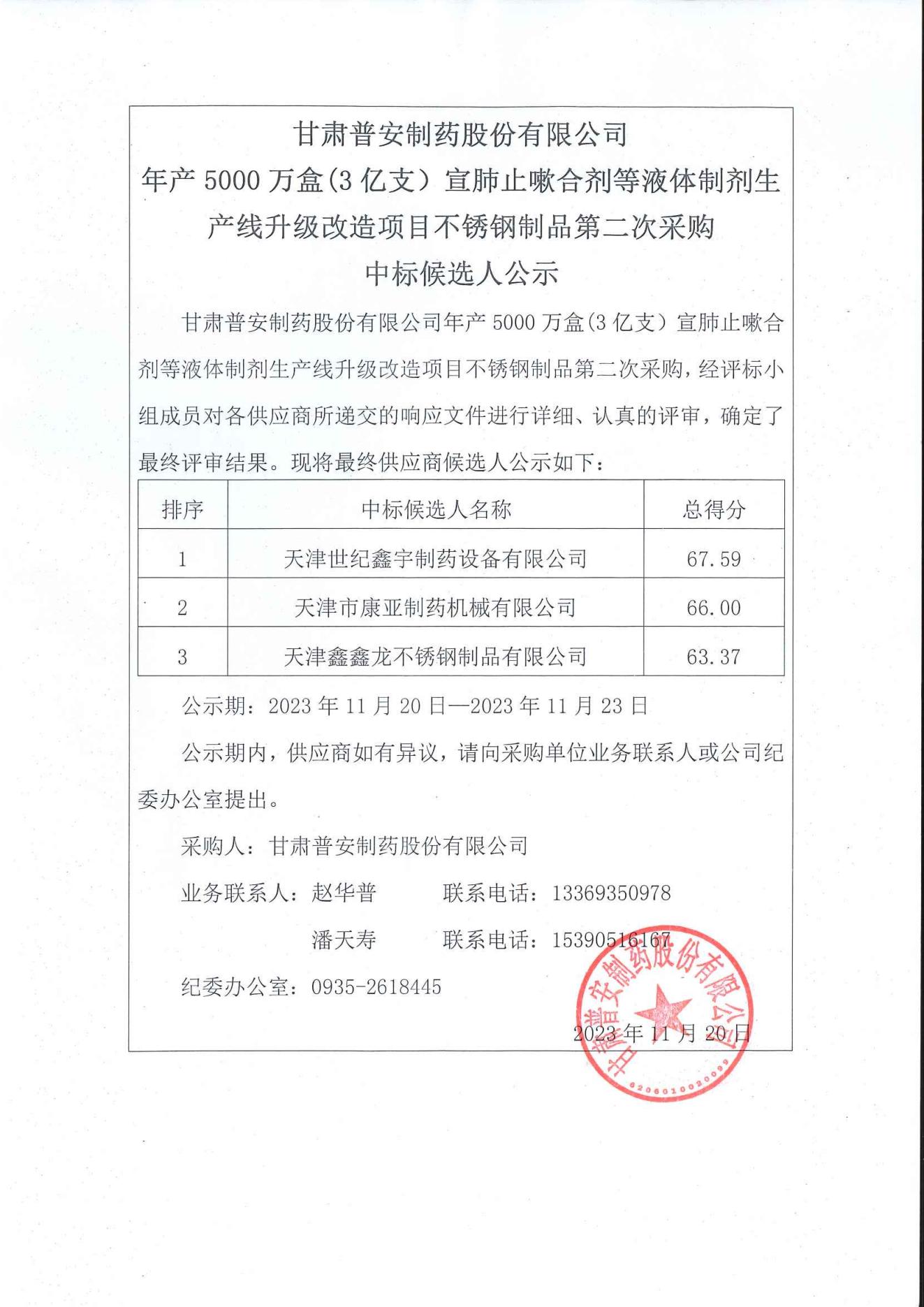 甘肅普安制藥股份有限公司年產(chǎn)5000萬(wàn)盒(3 億支)宣肺止嗽合劑等液體制劑生產(chǎn)線升級(jí)改造項(xiàng)目不銹鋼制品第二次采購(gòu)中標(biāo)候選人公示