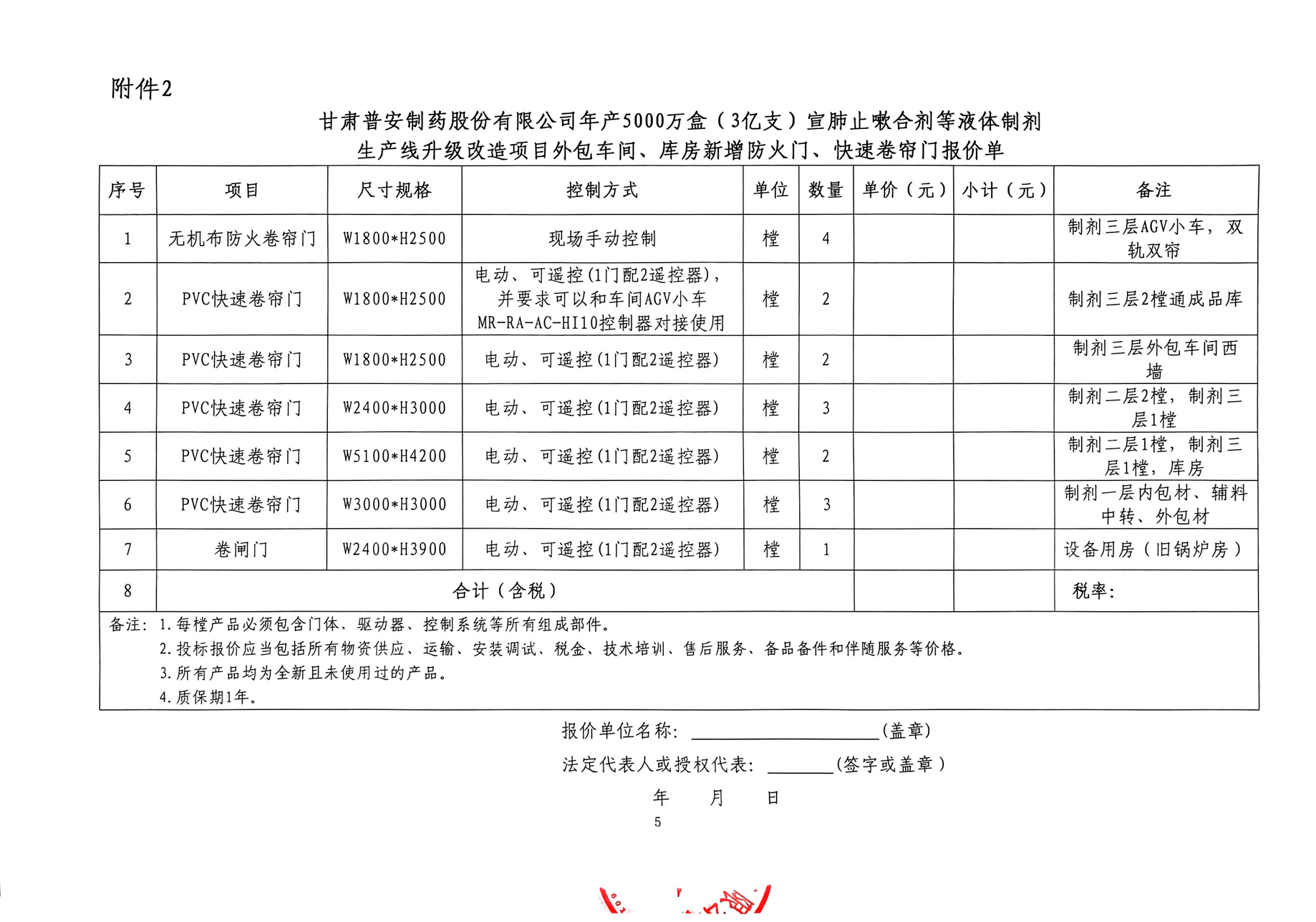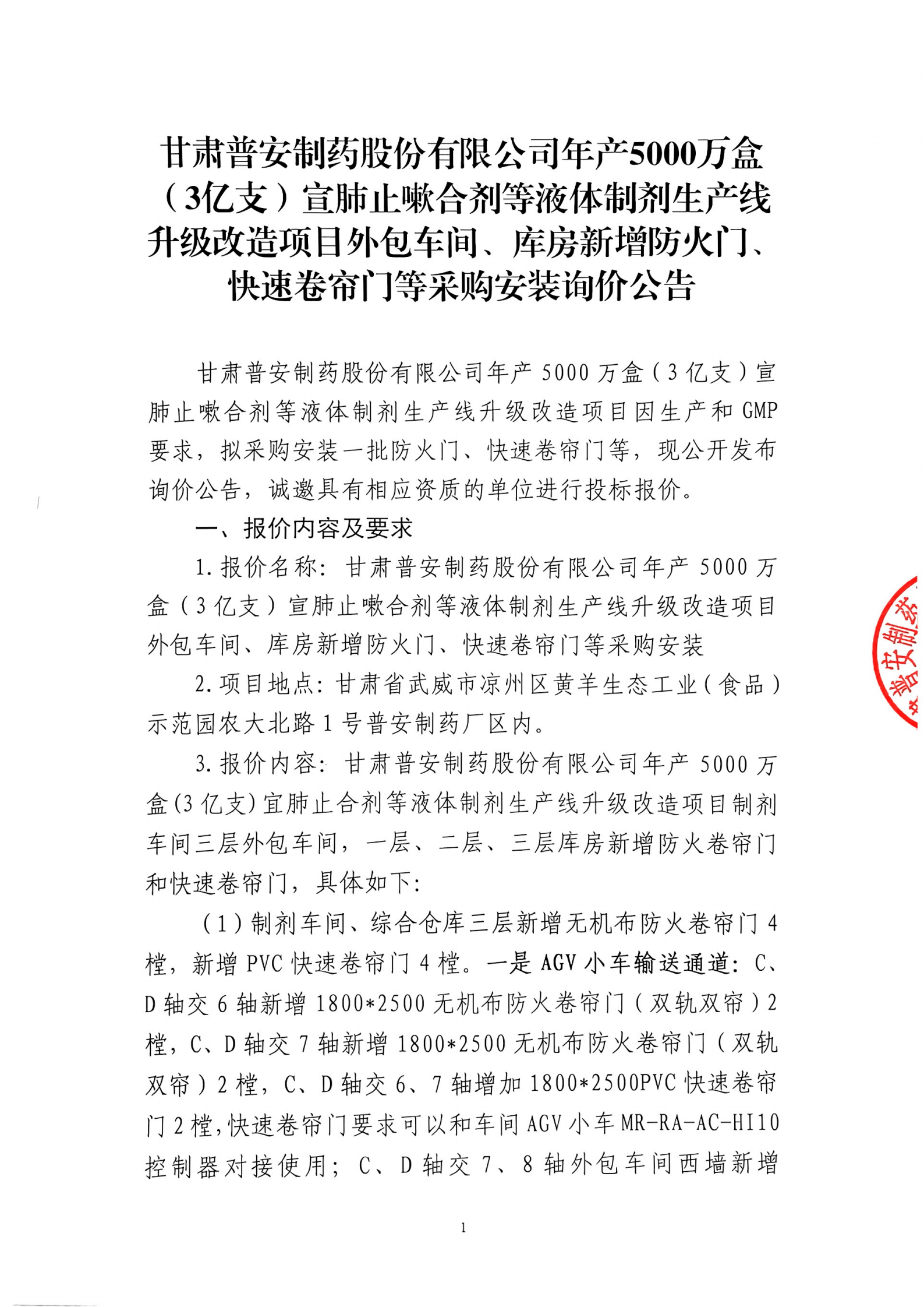 甘肅普安制藥股份有限公司年產(chǎn)5000萬盒(3億支)宣肺止嗽合劑等液體制劑生產(chǎn)線升級改造項目外包車間、庫房新增防火門、快速卷簾門等采購安裝詢價公告
