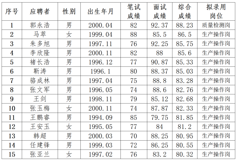 根據(jù)《甘肅藥業(yè)集團市場化招聘工作流程》,通過發(fā)布公告、資格審查、組織筆試、面試、體檢等環(huán)節(jié),現(xiàn)將擬招錄的15位人員名單公示如下: