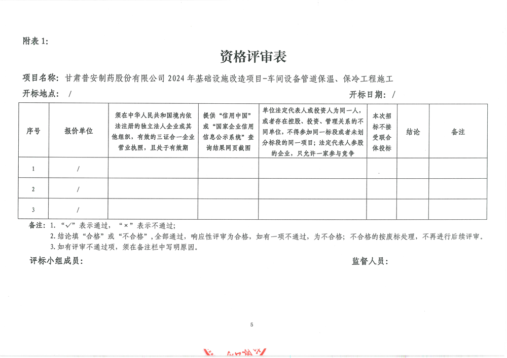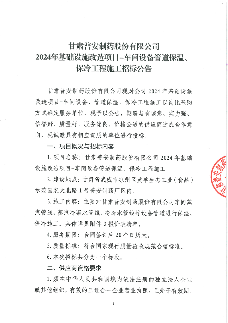 甘肅普安制藥股份有限公司2024年基礎(chǔ)設(shè)施改造項(xiàng)目-車(chē)間設(shè)備管道保溫、保冷工程施工招標(biāo)公告