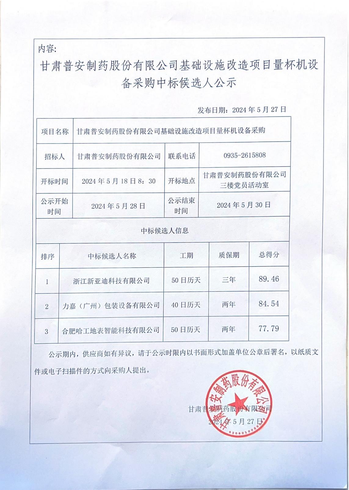 甘肅普安制藥股份有限公司基礎(chǔ)設(shè)施改造項目量杯機(jī)設(shè)備采購中標(biāo)候選人公示