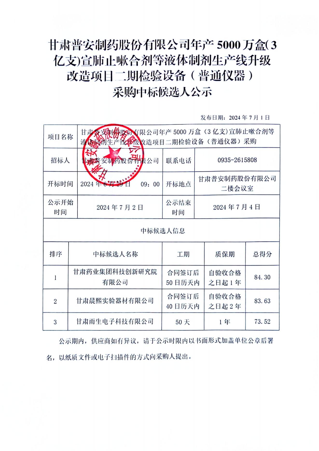 甘肅普安制藥股份有限公司年產(chǎn)5000萬盒(3億支)宣肺止嗽合劑等液體制劑生產(chǎn)線升級改造項目二期檢驗設(shè)備(普通儀器)采購中標(biāo)候選人公示
