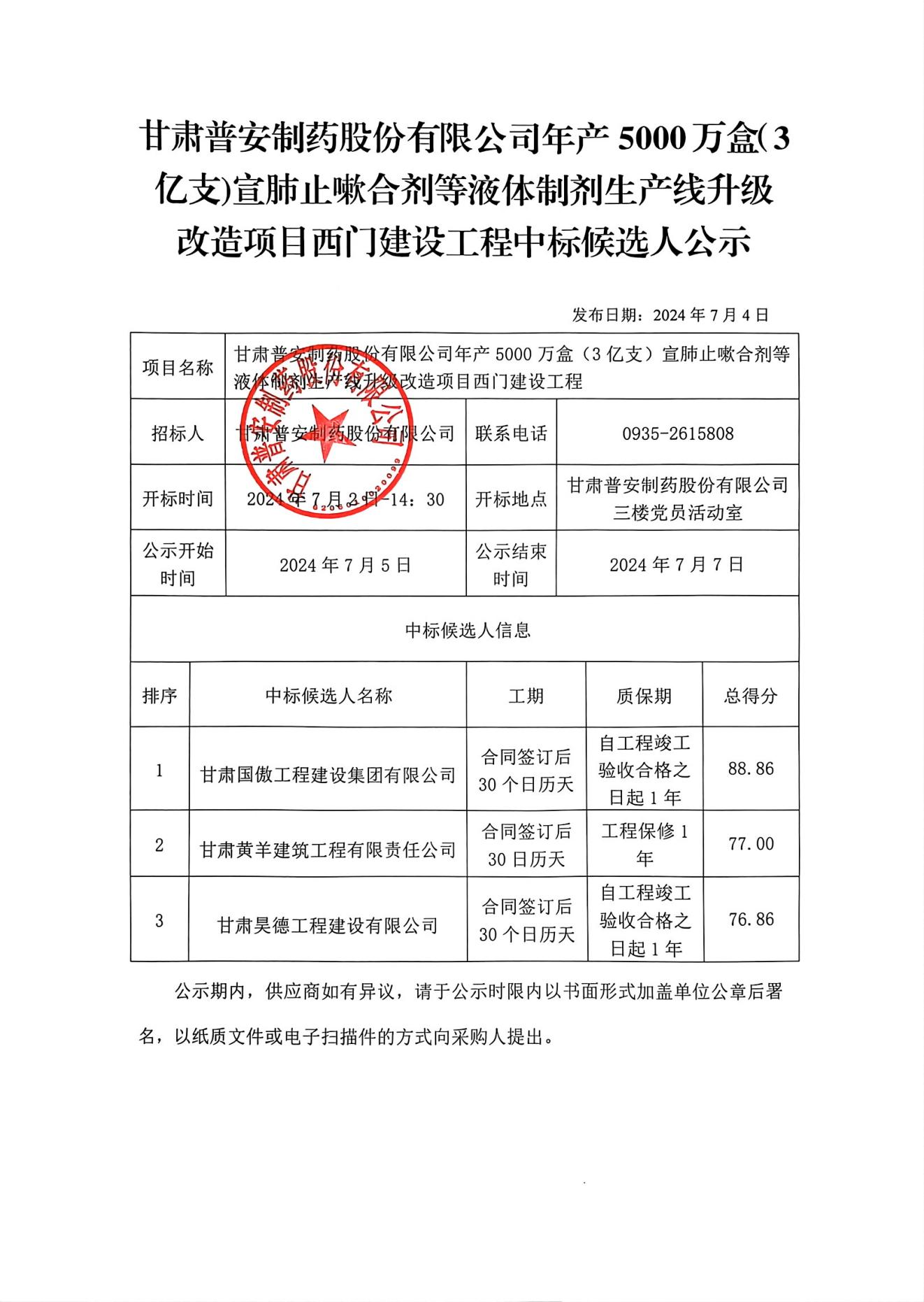 甘肅普安制藥股份有限公司年產(chǎn)5000萬盒(3億支)宣肺止嗽合劑等液體制劑生產(chǎn)線升級改造項目西門建設(shè)工程中標(biāo)候選人公示