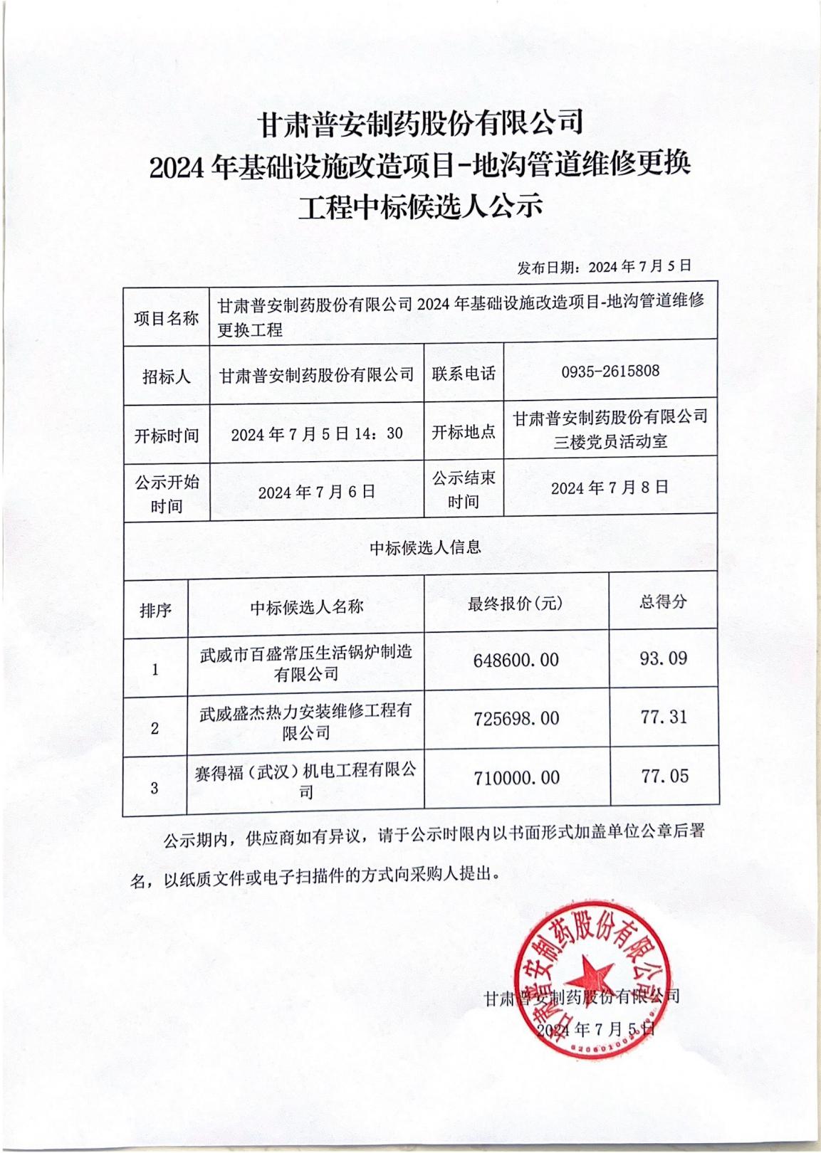 甘肅普安制藥股份有限公司2024年基礎(chǔ)設(shè)施改造項目-地溝管道維修更換工程中標(biāo)候選人公示